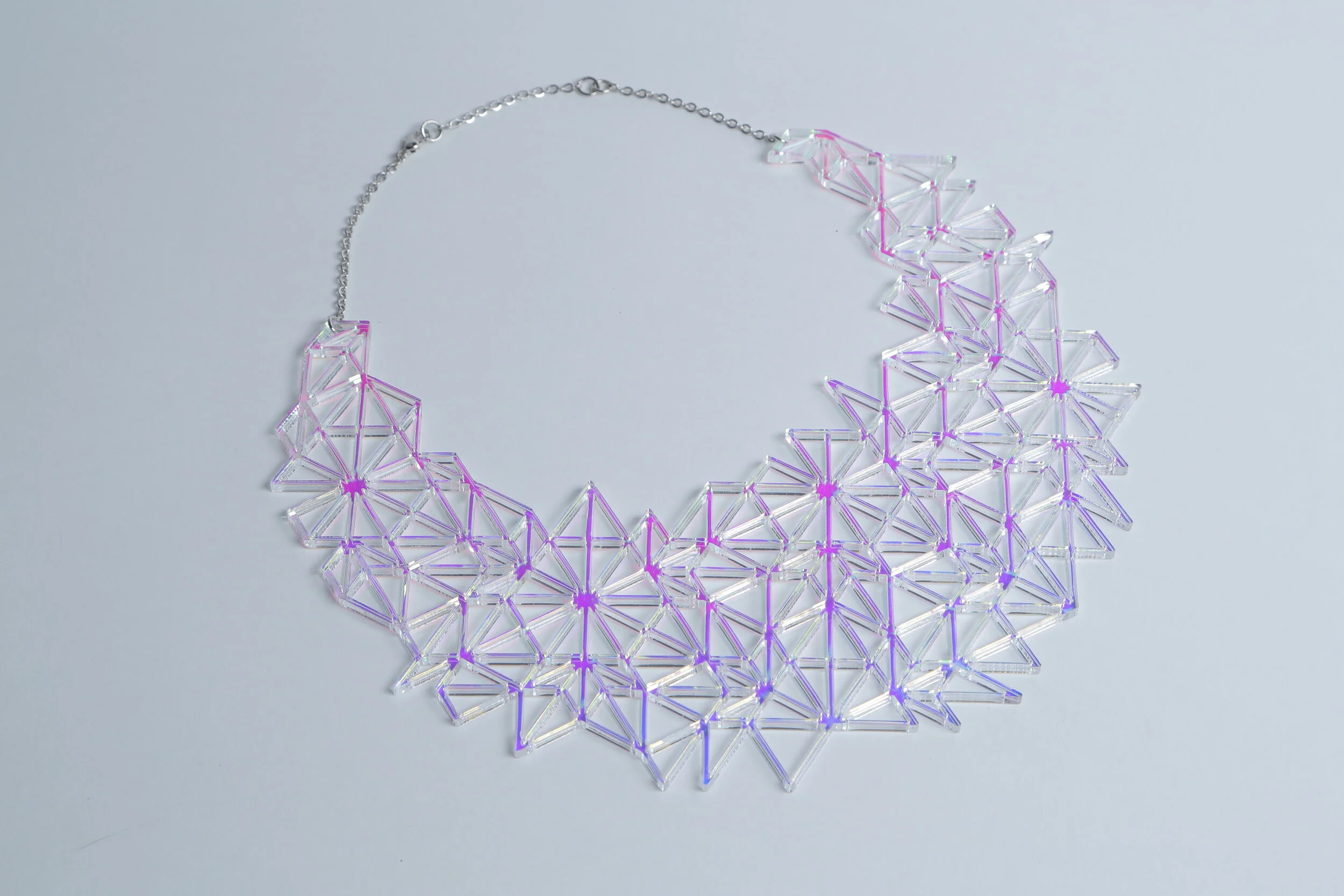 Iridescent Bib necklace lasercut from acrylic plexiglass. Also available in shiny black acrylic plexiglass. This design is based on a different tiling of my friend Christine Edison's origami triangle box.