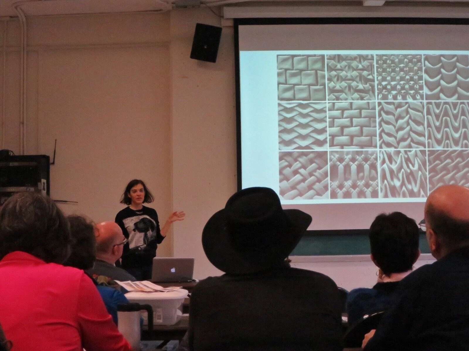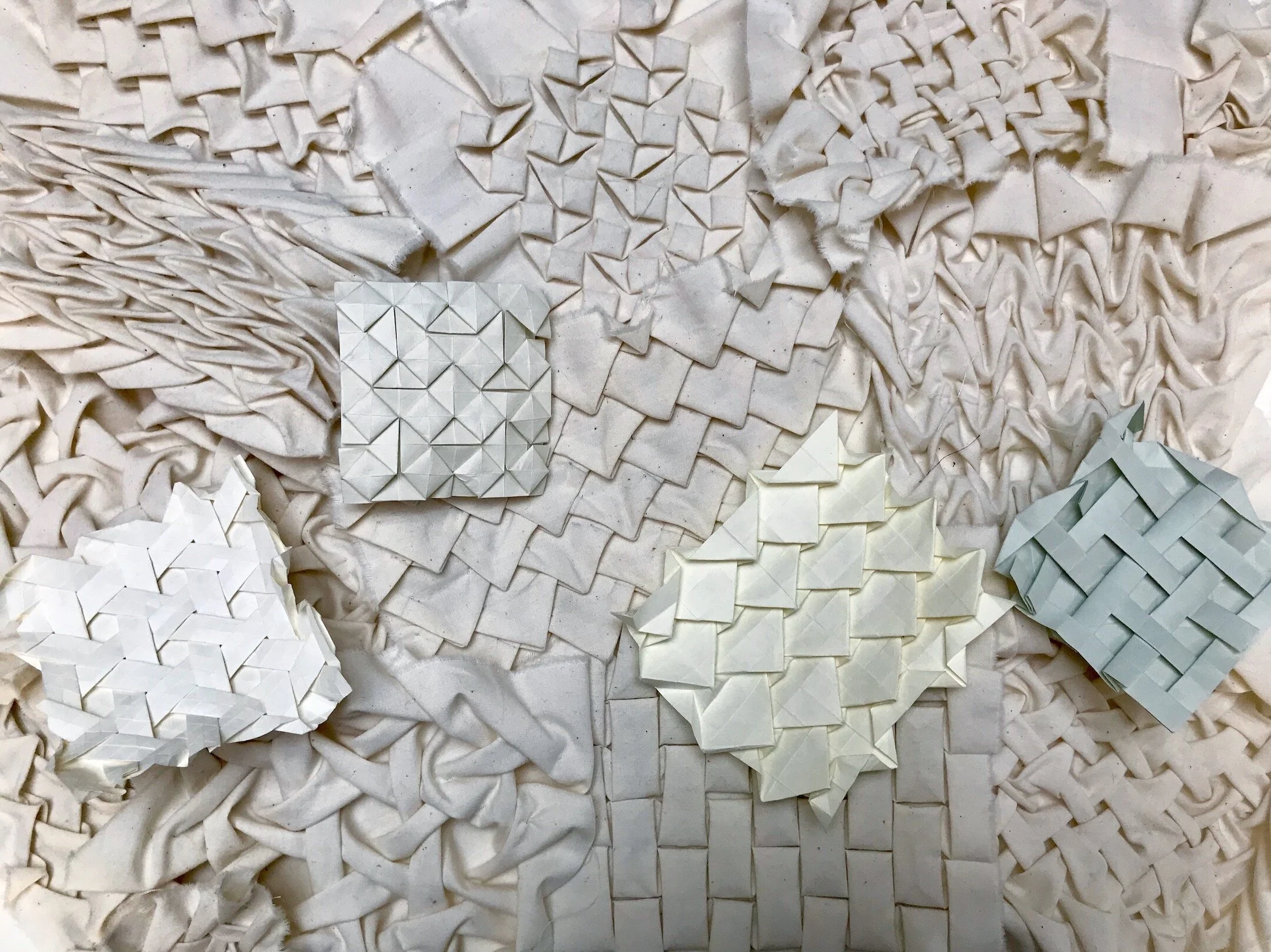 In my lecture I demonstrated that these fabric examples of North American smocking (aka American smocking aka Canadian smocking aka lattice smocking aka reverse smocking and more aka's) and paper origami tessellations are structurally identical despite being made with very different techniques.